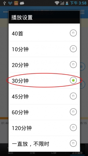 不仅有再放几首的设置,往下滑动还可以设置再播放多长时间,如下图