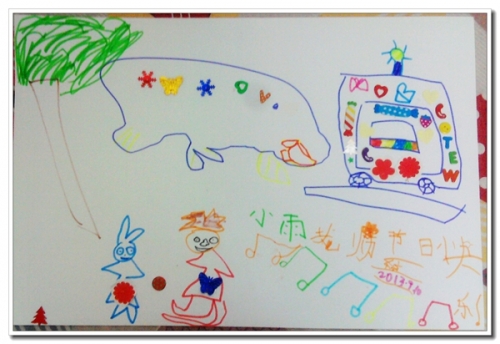 给小雨老师的,是她们在踢球,上面的图案比较抽象,婷说是公交车,我怎么看也像是北极熊在看电视,哈哈。婷画了将近两个小时,9点多了还要继续给其他老师画,我赶紧劝她休息了,这幅画上也提议少画点,可以用贴纸装饰一下的。