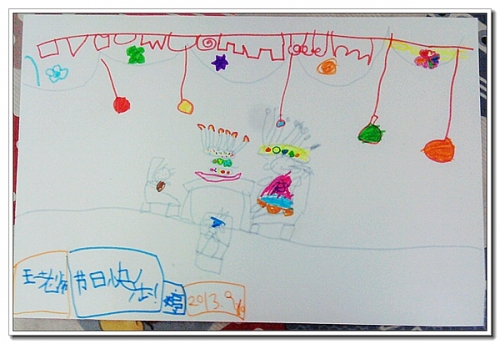 给王老师的,是她和王老师在吃蛋糕,王老师头上戴着王冠,旁边还有小兔子,婷和小兔子把房子装饰得很漂亮,有彩旗、彩灯、气球。
