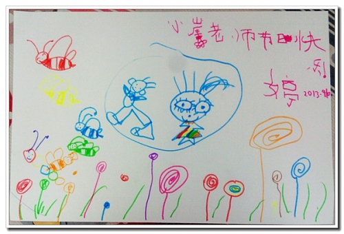给小崖老师的,一群蜜蜂旋绕花间,婷和老师在爱心里,她给老师穿了漂亮的彩衣。