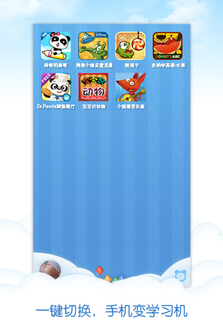工程师爸爸儿童桌面是专为0-10岁孩子家长推出的移动设备管理工具。它可将安卓设备一键切换为儿童模式,变身为儿童早教学习机,让你放心地把手机交给孩子。个性定制和密码保护的功能,在保护家长数据的同时,给予孩子独立玩耍和学习的虚拟空间。
