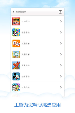 此外,工程师爸爸儿童桌面还为家长们精心挑选了国内外精品儿童应用,免去家长们自己去各应用市场找应用的苦恼,工爸挑选的可都是精品哦。工程师爸爸儿童桌面推荐的应用分为九大类:认知百科、数学思维、汉语启蒙、英语启蒙、艺术培养、益智思维、社会交往、生活习惯、家长助手。
