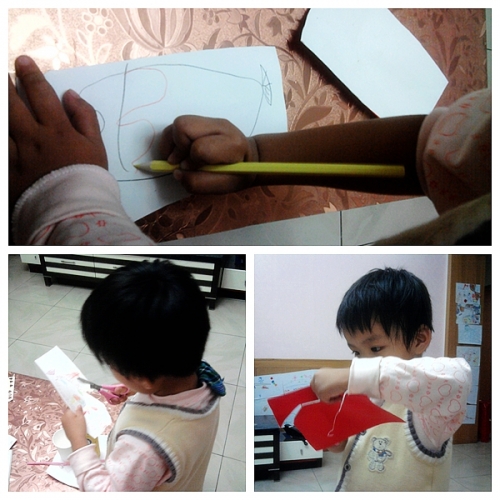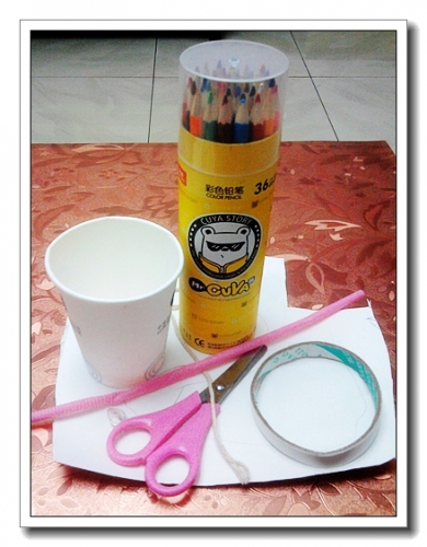 材料:彩笔(其实水彩笔颜色更漂亮,可是婷最近迷彩铅)、纸杯、吸管、卡纸(硬点的废纸就行,我们用的还是做小火车那个纸袋子)、双面胶、剪刀、线绳、扣子(或者珠子,啥也没有的话,用橡皮泥或者面团揉一个干了也行)。