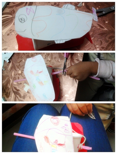 书上学来的,人家原来叫接泡泡。可是我们做的时候,婷说像在吃鱼食,我觉得也挺形象。是一个亲子游戏手工,很简单。