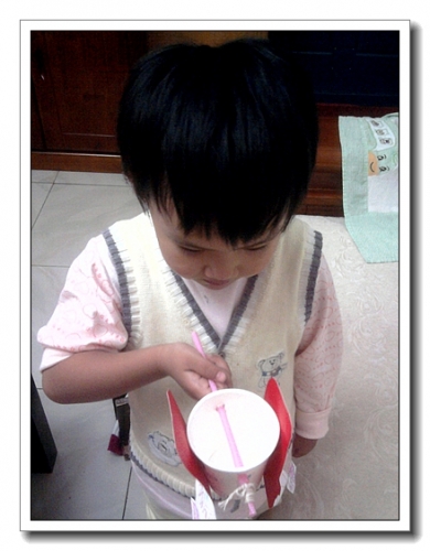 4.纸杯穿洞,把吸管穿过去,从弯头的部分剪断。