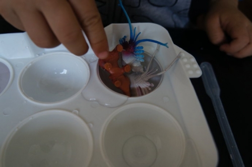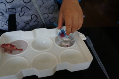 这套玩具有一套塑料制作的海洋动物和几个小恐龙,有两个塑料吸管,有一组制作冰球的道具,还有红黄蓝三种色彩颜料。和宝宝玩过两次了,不过冰球还没有做过,目前那个做冰球的道具被我们用来当做装水、调色的容器。