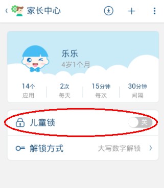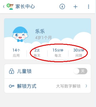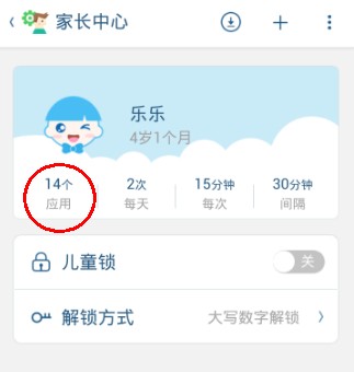 2、在家长中心点击宝贝头像下面的xx个应用,进入添加应用界面。