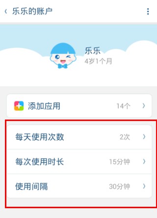 2、在账户设置界面可以设置宝贝玩应用的时间,每日使用次数和使用间隔。