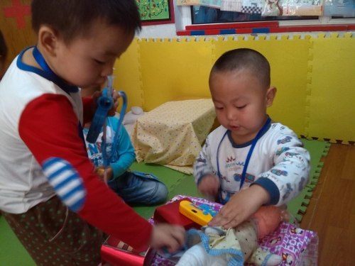 在上开放课的游戏时间时,老师让孩子自己选择自己想去玩的小区域,我家魏宝选择的是医院区角,选择在医院区角的有四位小朋友,一说要给小娃娃看病,小朋友们都要当医生,四位小朋友都去抢听诊器,老师来到特别是时候,要他们自己分角色,要有一个爸爸一个妈妈和一位医生一位护士,他们正好是三男一女的角色。 看魏宝给娃娃量体温还是挺像那么一回事的,张杰在那听诊器忙着来,那两位小朋友是去那退烧药去了,好忙的现场呀。