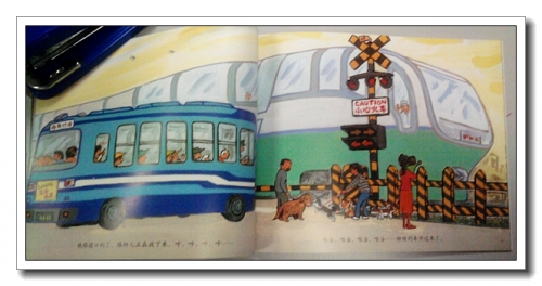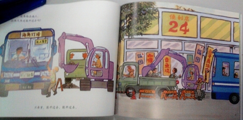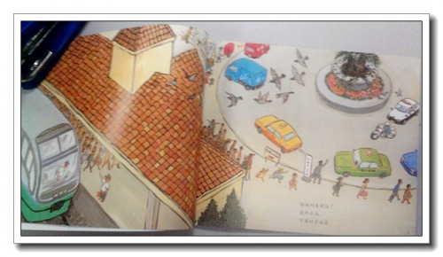 翻开第一页,很多的人物,刚从公交车上下来的、准备坐车的、还有旁边店铺附近的买家卖家等等,动作神态各异,有拎着行李匆匆赶路的,有正准备打车的,有不认识路拿着地址研究的,如果宝宝有兴趣,可以引导他对此进行猜测,看看每个人在做什么,说什么。出租车还分着不同的颜色,应该是代表不同的公司。