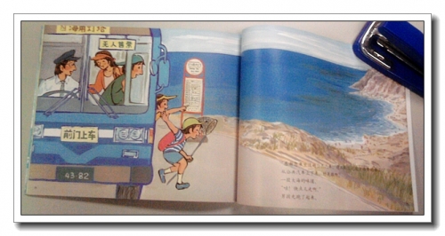 路上还会遇到许多情况,有特快列车通过时需要放下来的路杆儿,有正在施工的马路,有伐木工人在伐木需要绕行,还会经过黑黑的隧道。很远很远的路啊,终于到了海边,作者把它安排在隧道昏黑的页面之后,清爽的蓝色,让人豁然开朗。海边有人钓鱼,有人补网,有人划船。目的地到了,要下车的时候按铃就可以了,跟我们这里可不太一样啊。最后一页真美,蓝色的大海,灯塔耸立,海岸环绕,公路蜿蜒,想想,还没带孩子去过海边,明年的夏天,我们是不是也该出发,坐车去海边?