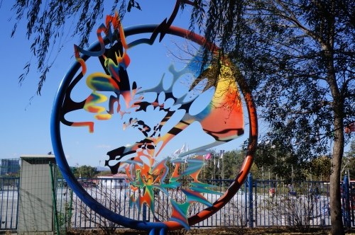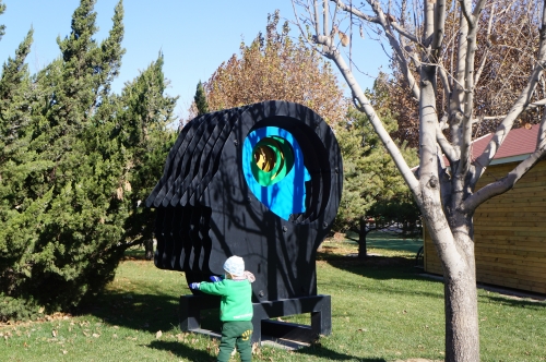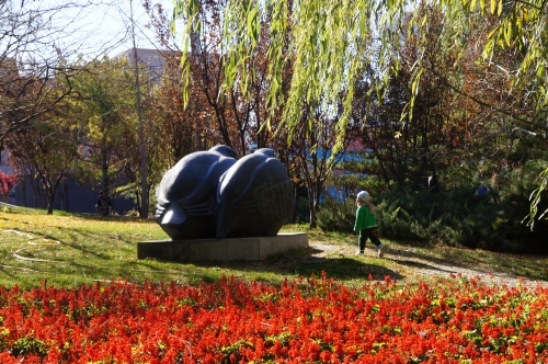 国际雕塑园,之前听同事推荐过,据说很不错,今天和老公一起带宝去。公园其实并不大,但比较有特色,雕塑还算多,小朋友也很感兴趣,到了每个雕塑跟前,我们都会问问他这个像什么?他自己也摸摸、敲敲他感兴趣的地方。里面还有一些儿童游乐设施,小朋友们最喜欢了。另外,还有一个很空旷的场地,适合放风筝,今天风大,不少家长都给孩子买了风筝,小朋友们放得很起劲。场地里还有租车项目,有孩子自己驾驶的电动车,也有多人自行车等等,种类还比较多。今天,我们3租了一个3人自行车,宝宝坐在最前面,我和老公在后面骑车,就是风大,车很不好骑,呵呵。