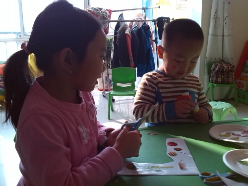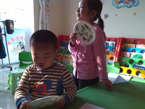 两个小朋友配合的特别的好,手工进展的速度就特别快,很快就把手工内容做完了。