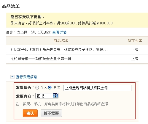 对于书单奖品,为了提高礼品分发的效率,建议大家采用以下自助方式:在工程师爸爸上选好书 → 当当上下好订单,抬头请填“上海童锐网络科技有限公司 ” ,具体如下图所示→ 将订单付款信息拍照或截图发送至邮箱editor@appshare.cn,并提供收款账号(来信请署上您在工程师爸爸的用户名) → 工程师爸爸为您报销100元。(鉴于书单奖品较多,领奖时间可以适当延长。)