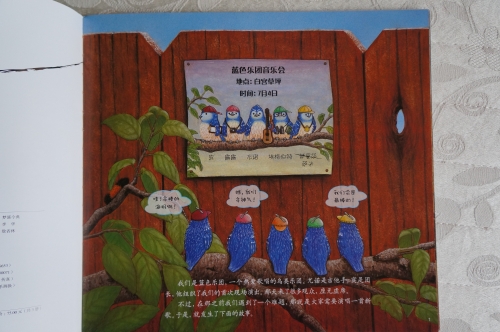 这本书可以看成一本绘本故事——它讲述了5只蓝鸟家族组成的蓝色乐团从大西洋岸飞到到太平洋岸,为了寻找一首新歌以便在即将到来的现场演唱会上表演。五只蓝色知更鸟家族的兄弟姐妹:宾、露露、尤诺、埃格伯特和萨米,它们的训歌之旅真的是一场有趣的冒险经历。