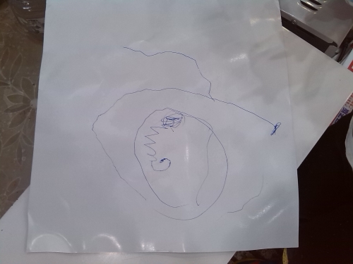我们拿的是包装衣服时用的纸板,他要我说他画,我先是鼓励魏宝自己画画,他画了以后我们就分析一下他画的是什么,下面是他画的画,我们是这样分析画的,画上是一个小朋友,小朋友戴着帽子看着一边的魏宝好像是要哭了,也不知道是不是魏宝欺负小朋友了,魏宝忙说妈妈我没有欺负他,他级是在看着我来是别的小朋友欺负他了,他要给我说来,大家看看我们的分析是不是这样的呀。