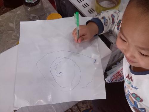 星期天魏宝和我一起上班上午的时候和他的一个小同学玩的号开心,等到了中午小朋友回家去了,就剩魏宝一个小朋友了,他就特别的无聊,老是说妈妈我们回家吧我不想在这里玩了,我要回家玩这里不好玩等,看到孩子这种情节我是很心疼孩子的,但是我还要上班就给他讲道理,并给他建议自己可以去的游戏。 一开始看了一会书,我觉的他是没有睡午觉再议看书就开始瞌睡了,就有开始闹人了,突然我说要他画画,并表扬他的画画的可好了,他一听我说他画的好久开心了,说好吧那我就画画吧,妈妈你要和我一起画才可以,我知道他是要我做在他旁边看他画画,我就好痛快的答应了他。