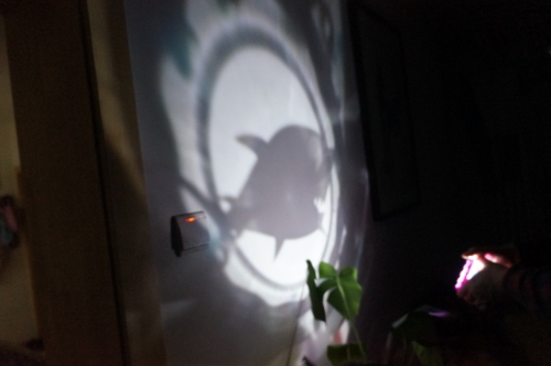 接着,宝宝拿着奇幻灯,自己替换动物纸片,我们的房顶额墙壁相继出现了海马、海龟、章鱼、鲨鱼等海洋动物。宝宝自己试验着离墙面近、影子小,离墙面远、影子大;趴在地上观察彩色奇幻灯;老公用大鲨鱼的图片,给宝宝边演示边讲解,改变奇幻灯的角度,可以看到变形的鲨鱼。另外,那张红色的胶片让我们一同体验了变色的动物。