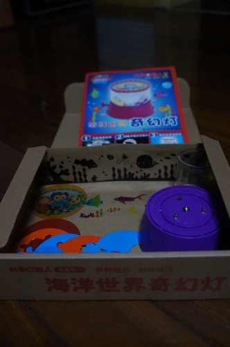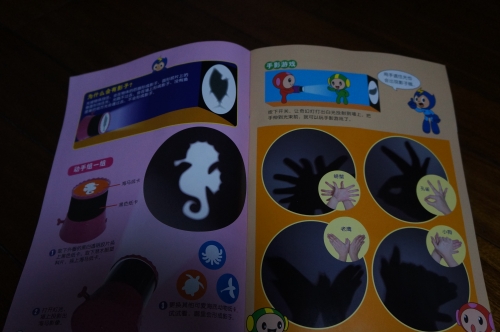 晚饭前的一个多小时,宝宝都在欢乐的体验着这套神奇的海洋世界,了解到了影子产生的原因、如何让影子变大变小等原理。其实,科学小超人这个海洋世界奇幻灯模拟的是中国传统玩具——走马灯的原理(这在使用手册的最后有介绍),一是热空气产生对流,让灯笼里的剪纸转轴转动,其次是珠光将剪纸的影子投射在灯笼的外层上,光纤直线进行,遇到剪纸形成骑马武将的影子,两种科学原理加在一起,产生转动的光影效果。太奶奶家真的有个走马灯哦,下次回去一定要让宝宝好好看看。