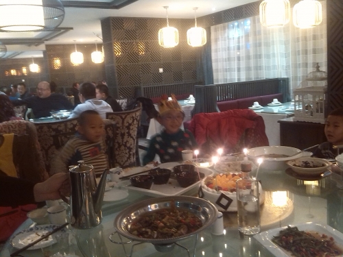孩子吃了蛋糕,还很开心了一下蛋糕花猫猫的游戏,在酒店了到处跑着往脸上抹奶油呀,把端菜的服务员看的好开心,也就自己小心的端菜,不去关他们闹腾了。