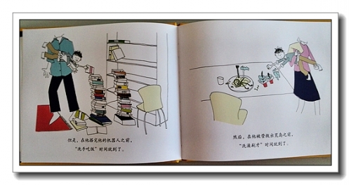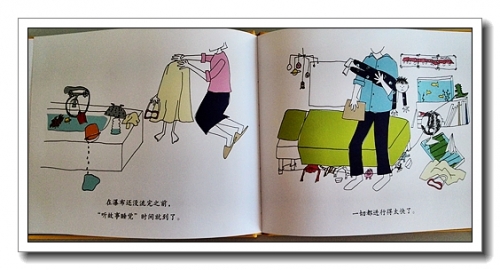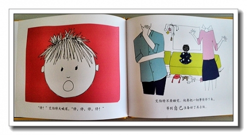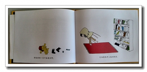 第一页,“学校里的一天可真漫长啊,艾伯特很开心能回到家。”婷现在也是这样,一方面感叹幼儿园真好,有小朋友跟她玩儿,一方面又希望我每天能早点接她,快快回到家。艾伯特把外衣裤散落了一地,抱着椅子冲向了书柜,跟婷真的很像。
