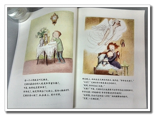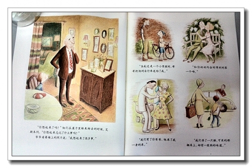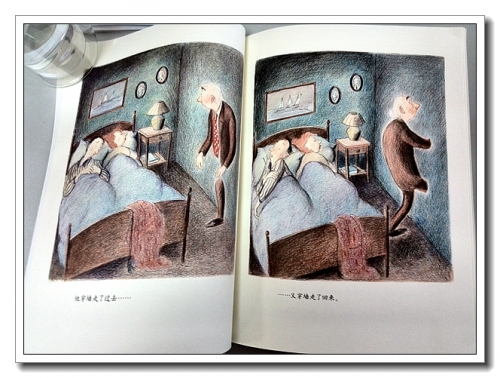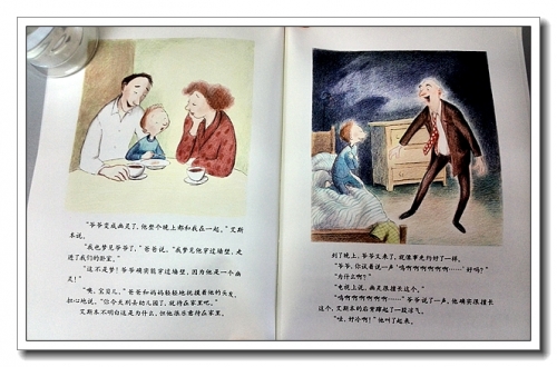 艾斯本看到爷爷忧伤得坐在柜子上,作为一个幽灵。他心神不宁,因为他觉得他不应该在这里,可是却在这里。只有在和艾斯本玩儿的时候,爷爷脸上才会露出笑容。爷爷穿过墙又穿回来,我想起我很小很小的时候看过的一个电视剧《高楼轶事》,敲三下,就能穿墙而过,这可是只有幽灵才能做到的,印象颇深。书上说如果一个人忘记了一件事,死后就会变成幽灵,于是艾斯本和爷爷一起寻找他忘记的事情。他们来到了爷爷的家里、在小镇子上转来转去,爷爷想起了许多美好的事情,可是都不是他寻找的事情。艾斯本把这些事情告诉了父母,可是他们却只是担心得对他说,今天他休息一下,不要上幼儿园了。