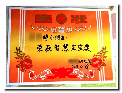 在活动的过程中,老师突然开展了颁发奖状的环节,婷正拍着的手停了下来:“妈妈,有没有我的奖状?”那时候我不知道老师是怎么安排的,一时也不知该说什么好,正好第一批获奖的孩子是因为全勤,于是只能跟婷说,我不知道,因为你没能坚持天天来(婷这个学期已经比上学期好多了,体质有很大的好转),看得出,婷很失望。不过老师安排得还是不错的,到场的每个孩子都有奖状,婷和另一个男孩子获的是“智慧宝宝奖” ,婷开心坏了。