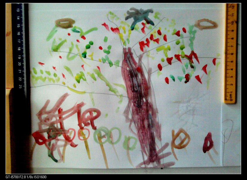 这是一棵大树,棕色的树干,绿色的叶子,红色的果实。墨绿色的太阳,呵呵,太阳旁边是云。下面那堆看起来乱七八糟的是大树的朋友——花儿们。