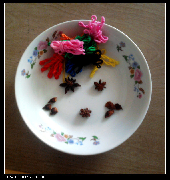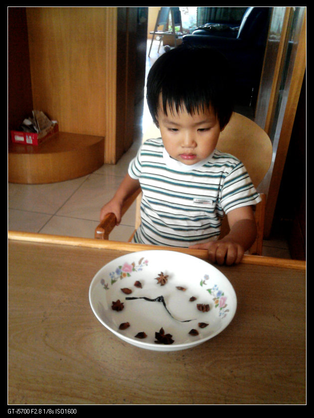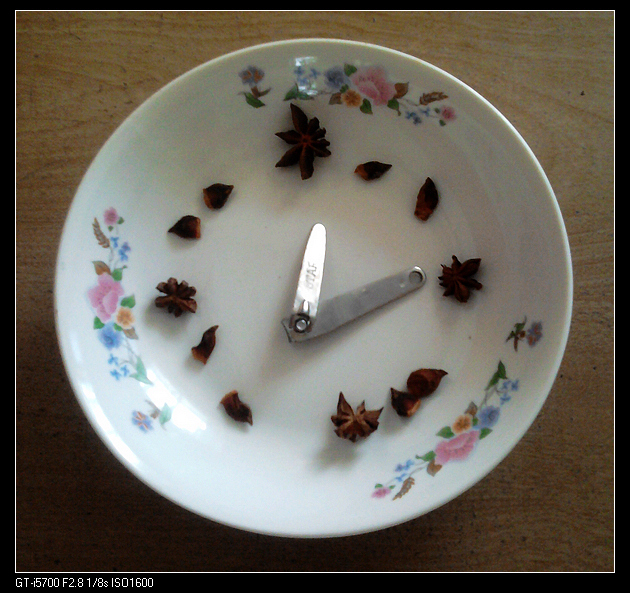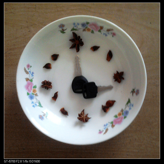 我拿来了一个盘子,又找到些大料,指导宝宝先用四个大点的上下左右定位,然后每个空挡中间填两粒小的,时间标志就有了。指针让我们动了点脑筋,宝宝自己用塑料片弄了个弯弯曲曲的指针,老爸的意见是钥匙,我翻出来个指甲刀,嘿嘿,都上来,看看图。