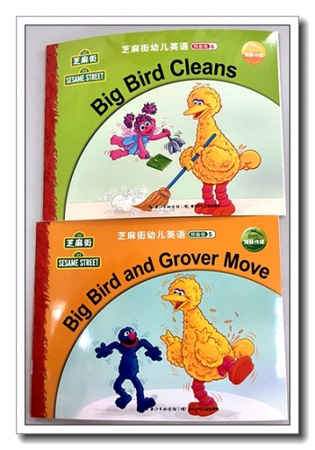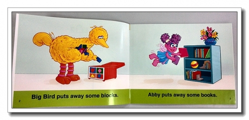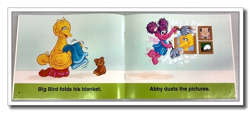 《Big Bird Cleans》是大鸟和艾比整理房间,他们分工合作,有的收拾玩具,有的扫地,有的掸灰,在学习英语的同时,引导孩子养成自己整理内务的好习惯。整齐的房间多漂亮,还可以引导孩子猜测这是谁的房间,为什么?(房间里挂着大鸟和蛋的照片)讲完了夸一句大鸟和艾比真棒,会做家务,婷马上说,妈妈我也会做,然后去那笤帚和墩布。