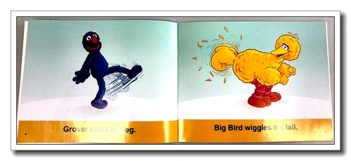 《Big Bird and Grover Move》是帮助孩子认识身体的,格罗佛和大鸟分别运动自己的每个部位,摇头、踢腿、跺脚、摆尾等,不仅认识了“头、翅膀、鸟嘴”等身体部位的单词,还相应学会了“摇、踢”等不同的动词。一边学英语,一边和宝宝动起来,就像一个亲子韵律操。