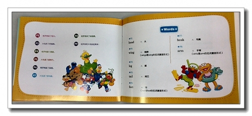 故事虽然简单,但并不是没有情节。大鸟和格罗佛活动了身体,开始跳舞;大鸟和艾比打扫完房间,房间干净了,他们却变脏了。书后面附有句子释义和单词翻译,很适合4岁左右的孩子开始英语启蒙,还有相关的音频、视频资料,帮助向我这样英语水平不行的人亲子启蒙。