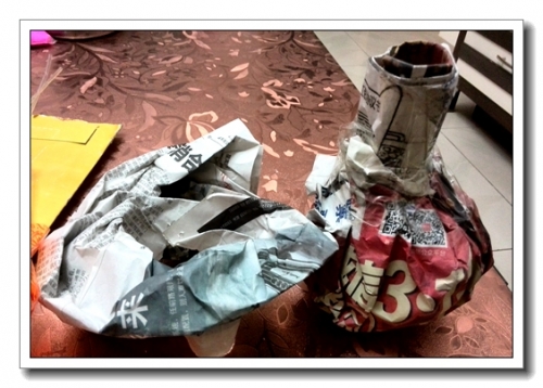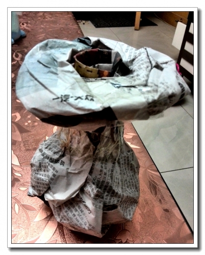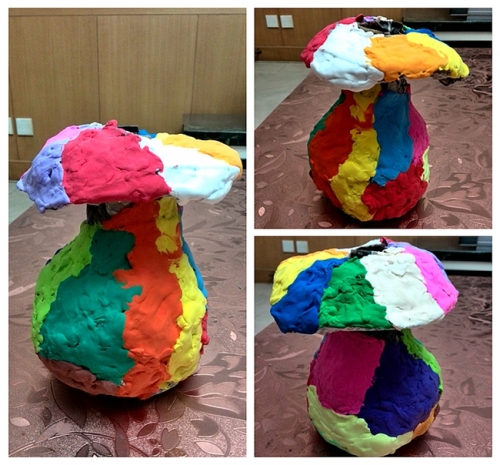 好大的工程啊!得用多少橡皮泥!秉着我一向抠门的习性,先拿报纸打底儿,再拿纸粘土包装。婷很有我的作风,纸粘土是能抹多薄抹多薄,所以我们的作品出来是如此的皱皱巴巴,崎岖不平。而且在色彩的使用上,秉着不能把一块全部用完,要均衡的原则(我是这个原则,婷则是喜欢彩色),各种颜色轮番上阵,要多多彩有多多彩。