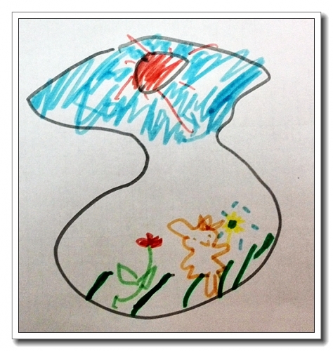 跟婷作手工,说好橡皮泥捏花瓶。我本来想的是捏个小小的、拇指大小的花瓶意思意思就行了,婷却真的拿来一束花,要求做个能把花放进去的,还给我画了图纸: