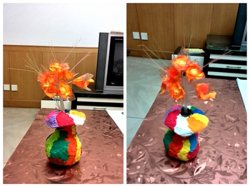 就这么个丑瓶子,用了我俩2个小时,时间都花费在抹泥儿上了。婷干得很开心,9点半了还不肯去睡。看着完工的作品,我暗叹:好丑!好像是乞丐身上的各色补丁,于是给它起名“乞丐瓶”。婷给它起的是“蘑菇瓶”。
