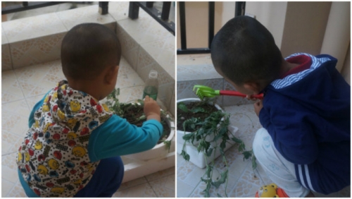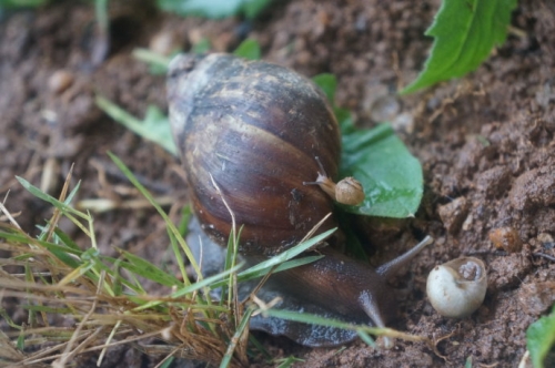 过了两天,我决定给儿子制作一个更好的蜗牛屋,于是,某天下午,我和儿子带上小铲子出发了,铲点土,移植两株植物,居然我们在小区里发现了一株开花的含羞草(多亏有了植物园的先前启蒙,我和儿子见到了含羞草的花)。我费了九牛二虎之力,终于将那株小小的含羞草移植到我们的蜗牛屋里。看呀,以前简陋的蜗牛屋俨然升级成为高端大气上档次的蜗牛屋。不光我和儿子很喜爱,相信蜗牛比我们更爱他们的新居。大蜗牛闻到泥土的香味也探出脑袋出来,小蜗牛更不要说爬得很欢,叶子上面,叶子下面,大蜗牛的壳上,他们都喜欢。不过和小蜗牛相比,大蜗牛有点“懒”。而且每天早上发现它的时候,总是看到它会把身体埋在土里比较深的地方,并且会找叶子比较茂密的地方睡觉。另外,真正观察了蜗牛,才发现原来蜗牛爬行的速度一点也不慢呢。