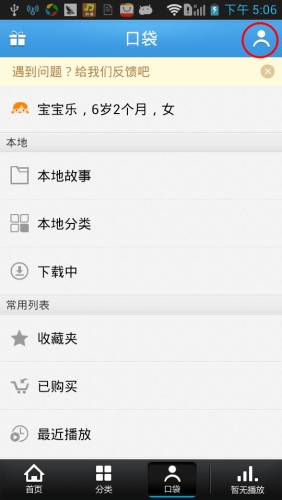 打开故事口袋听听后,切换到口袋界面,点击右上角的图标,见下图: