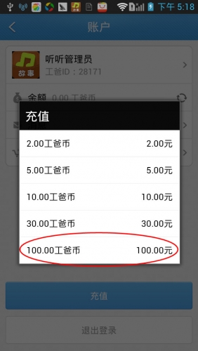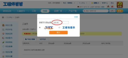 选择100.00工爸币(支持支付宝和银联支付),见下图: