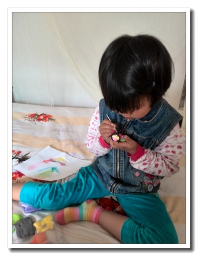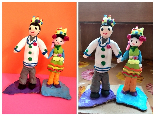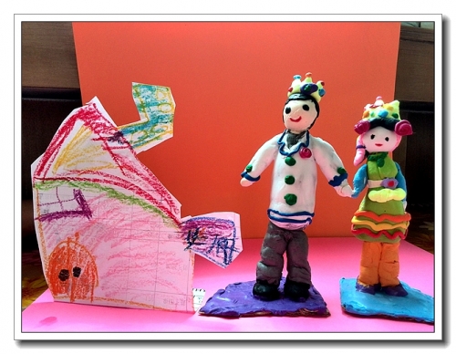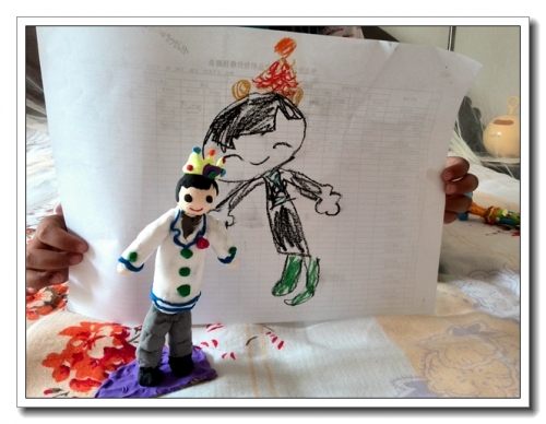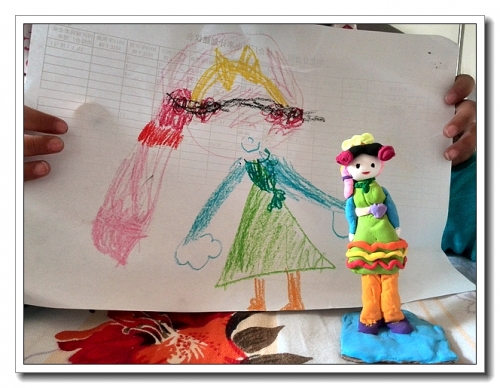 婷也到了喜欢公主的年龄了,公主裙,公主鞋,王冠。喜欢芭比,喜欢公主故事,喜欢画公主。星期天上午天气不太好,没出去玩。按婷的要求,跟她一起把她的画捏出来。