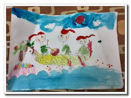 婷的作品,我问她龙舟是不是漂到天上去了,不在海面了,婷说,那红色的点点是浪花,龙舟被浪花卷起。前面是远处的小岛,上面还有椰子树。