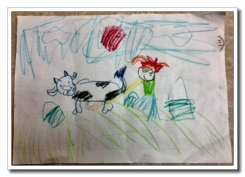 婷想象着画的给奶牛挤奶,奶牛很像啊(虽然我乍一看的时候,给看成了小狗,嘿嘿)。