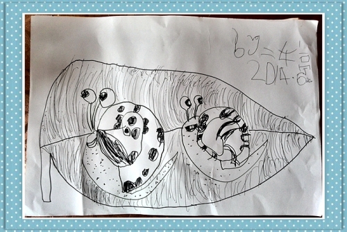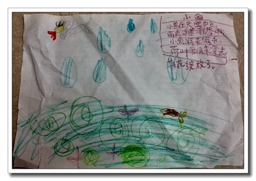 这是婷跳舞的时候,我旁观了一堂美术课后,照着教婷的,我不是个好老师,而且超级没耐心。不过婷的作品还是很有生气的。