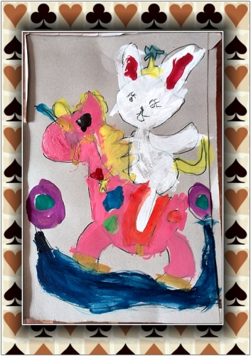这幅画婷是先打了铅笔草稿的,草稿很细致。可惜用勾线笔勾的时候,小家伙图快,线条不但不圆润流畅,而且上完色了,我才发现,马尾巴长到兔子背上了(我只看了铅笔图,当时马尾巴还是长在马屁股上的)。
