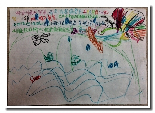 婷的另一幅“写生”作品,画的是公园的桥。文字同样是姥爷记录的婷的话,直白,却如散文——