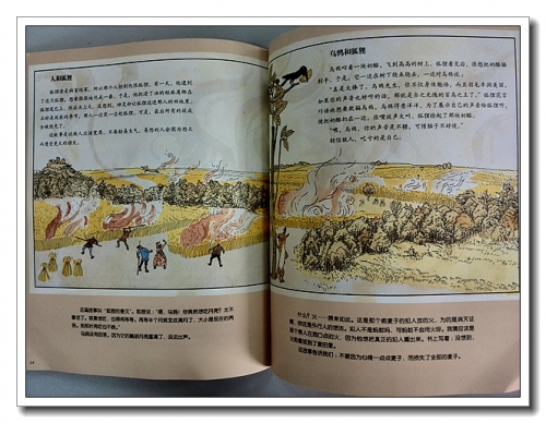 《山羊和驴》、《赶驴人和驴》那页,狐爸爸的解读很有趣——这两幅图画放反了,驴不听主人的话,掉下山崖摔断了腿,如果不看文字,倒真是给前面这个故事中受伤的驴子一个原因。