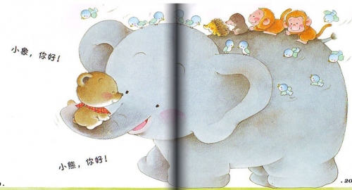 我们猜猜,他们都是怎么到小象背上的啊?小鸟可以飞,可以跳,抱着宝宝飞,跳,举高;猴子爬,抱着宝宝去攀爸爸的身体;小熊可能是大象鼻子托上去的吧,就像电梯一样,可以让爸爸托着宝宝到妈妈的背上。