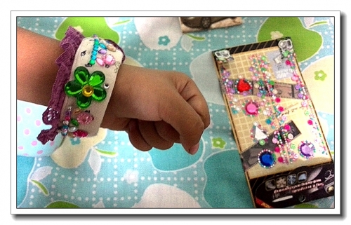 给婷看《我来扮妈妈》,婷好喜欢里面的首饰卡纸,一直问我她能不能带上,可惜,那些都是样子啊。婷跟我一一盘点,她有项链、手链、戒指、耳环,可是没有手镯。好吧,宝贝的要求就是妈妈的动力,尽管妈妈的执行效果从来都上不了台面。