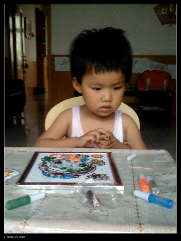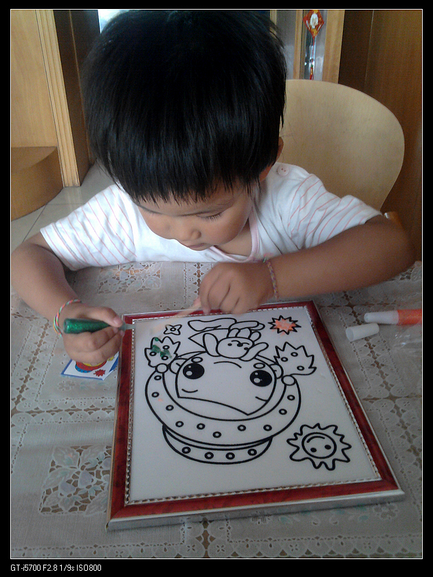 上午做了一半,好说歹说才肯去睡觉,下午早早就醒来了,继续开工。给定的颜色跟图片的示范色不同,孩子可以随意挥舞。