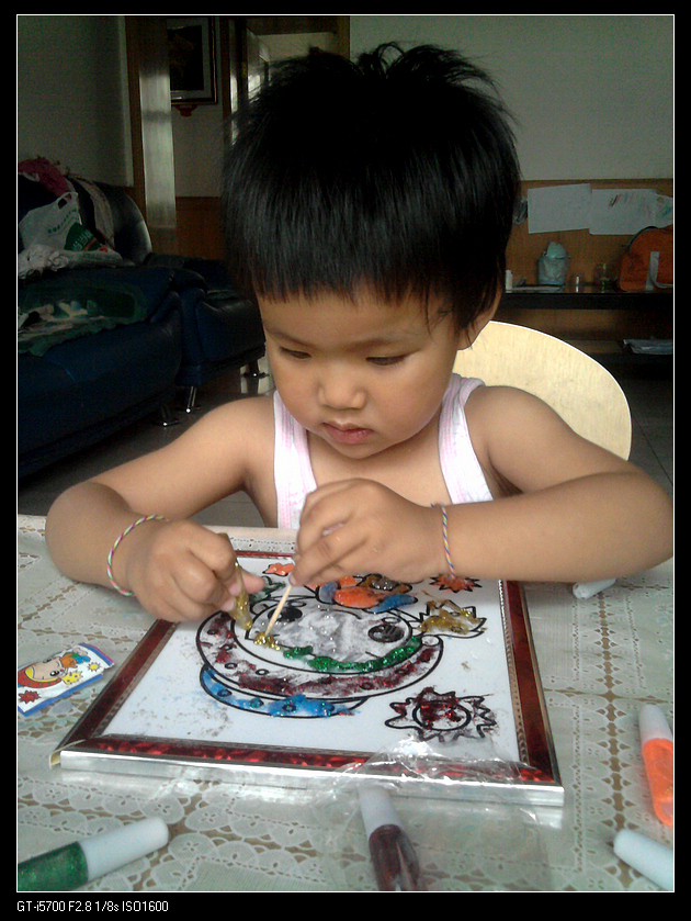 因为宝宝是第一次画这个,颜料涂抹不太均匀,厚的部分很久才干透。宝宝特别喜欢这个,但是因为上面都是金粉,特别容易沾到身上,所以不敢让她玩的太频繁,打算一个星期一次——比早教课可便宜多了,呵呵。