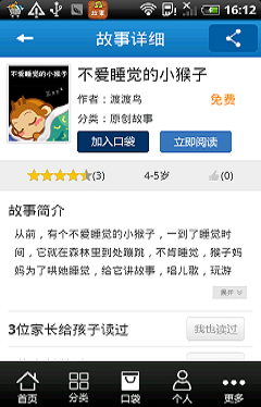 《故事口袋-读读》是一款免费的儿童故事阅读类平台型产品,提供1-10岁儿童的精品故事,可用于各类Android设备。分类涵盖:原创儿童故事、童话、成语、名人故事、儿童寓言、儿童文学及历史故事等。目前已提供的故事达数百个,内容每天更新。